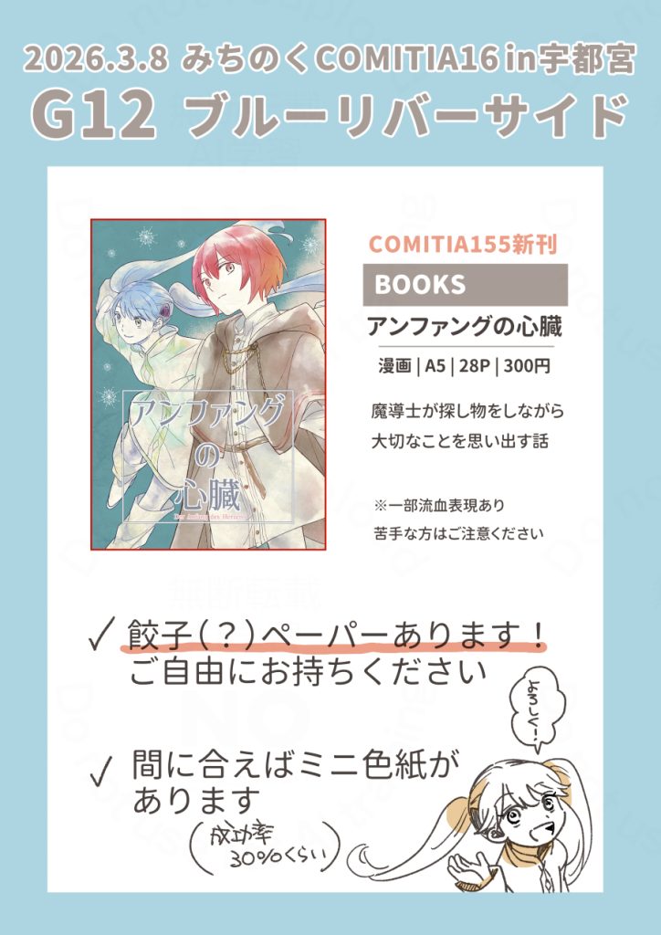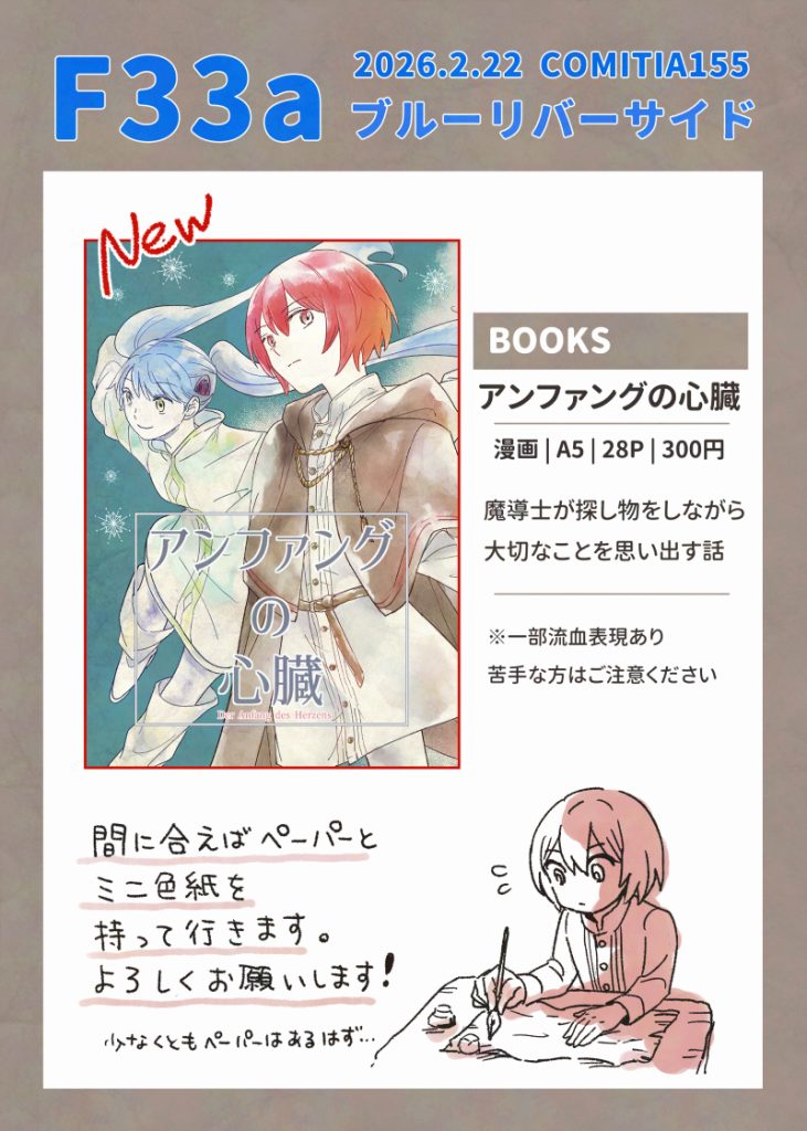 結果かなり身体を酷使しまくりギリギリの作業時間(二度とやってはいけないレベル)でしたが何とか通常入稿で発行できて、お品書きをブルスカにアップし、ペーパーとミニポスターも印刷し(22日0時の限界作業)、当日は9時にサークル入場してスムーズに設営を終えるという今までのコミティアで自分史上一番まともな事前準備となりました…